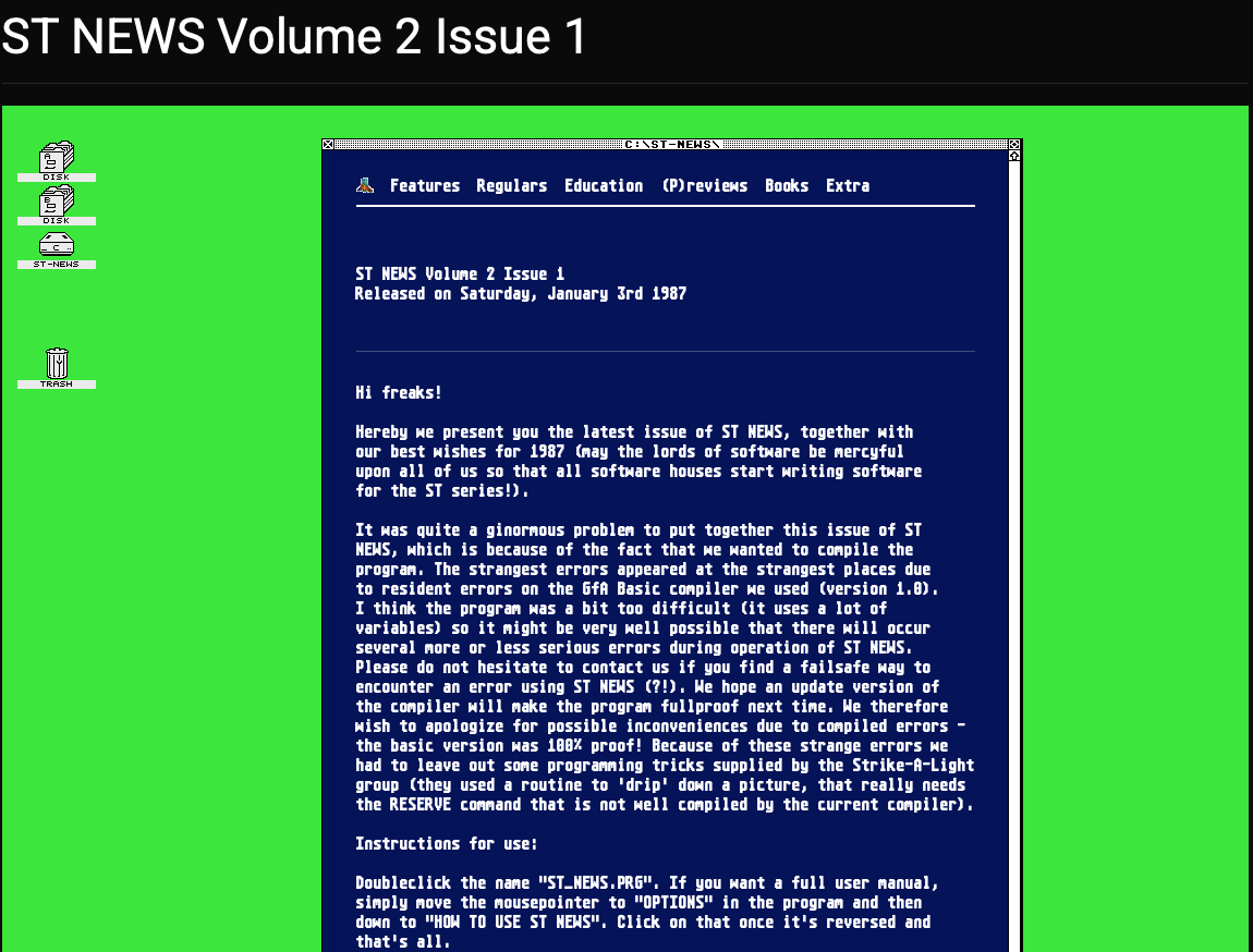 ST-News war das vielleicht wichtigste ST-Diskettenmagazin und auch Teil der Szene, die in Breddins Buchtrilogie vorgestellt wird. Auf der Website gibt es zwar keine News, aber alle Ausgaben zum Herunterladen, aber auch zum Online lesen – natürlich in passender, ST-ähnlicher Gestaltung. Heimliches Highlight ist aber die „Gallerie“ – fast schon eine Untertreibung, denn es handelt um die privaten Fotoarchive der ST-News-Autoren, die in den zehn Jahren ganz schön herumgekommen sind. Im Downloads-Bereich gibt es die Spiele und Software, die im Lauf der Zeit von der ST-News zur Verfügung gestellt wurden. Gleich darunter führt Richard Karsmakers fort, was ihn bis zur nächsten STNICC (2032) beschäftigen könnte: „alle anderen Disk-Magazine“. Er sammelt Informationen, teilt etwas über die Geschichte und, wenn möglich, auch das Magazin selbst. Ein definitiver Abschluss ist bei so einem Projekt kaum möglich, denn viele Disk-Magazine sind in der Versenkung verschwunden, meist, ohne die Einstellung des Magazins anzukündigen.