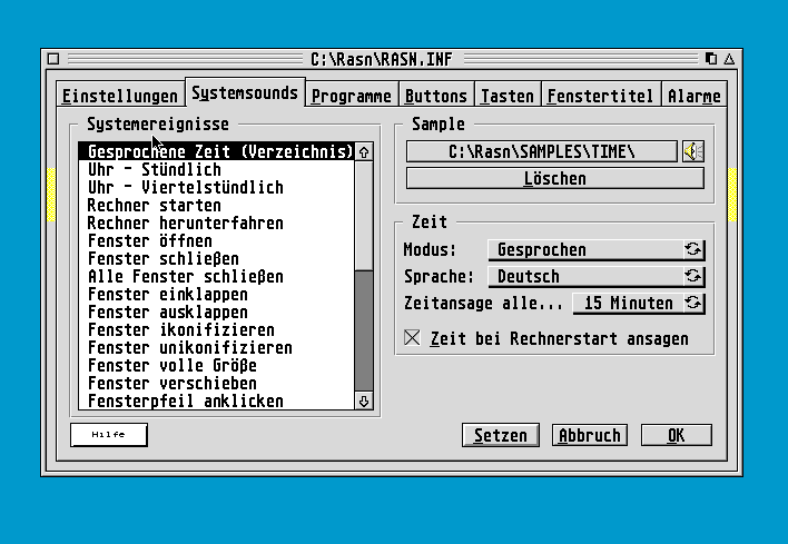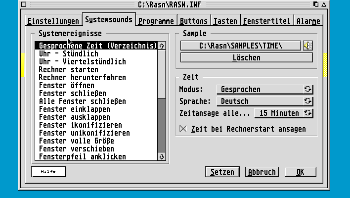 softwareRational Sounds 2.0.2 24. August 202524. August 2025 Ein ehemals kommerzielles Utility, das Systemereignisse mit frei wählbaren Samples belegt. Installiert wird Rational Sounds via GEMSetup, ein Multitaskingbetriebssystem wird empfohlen. Rational Sounds 2.0.2
